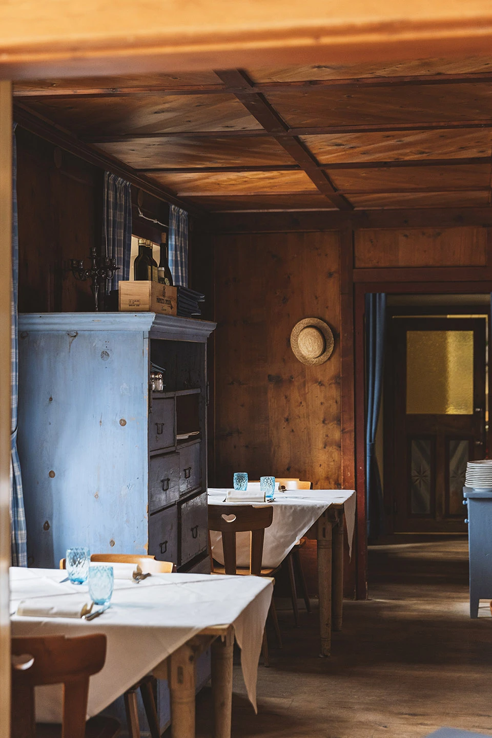 El Brite de Larieto is located in a beautiful historic farmhouse that once belonged to Riccardo’s grandparents. Riccardo spent his childhood here, tending the cows and goats. He often helped his mother prepare meals on the old stove in the charming main house. Riccardo’s future, however, seemed to lie on skis — he had a promising career as a skier in major European competitions — but his ambitions were thwarted by an injury. His wife Ludovica convinced him to use his culinary talents, and two decades ago he founded El Brite de Larieto. Here he now immerses his guests in rural life, with dishes from the local area. The menu is based on recipes passed down through generations and each dish is prepared with fresh ingredients. Inside, by the fireplace, it is incredibly cozy, and outside on the terrace, you enjoy a wide view of the imposing mountain peaks.