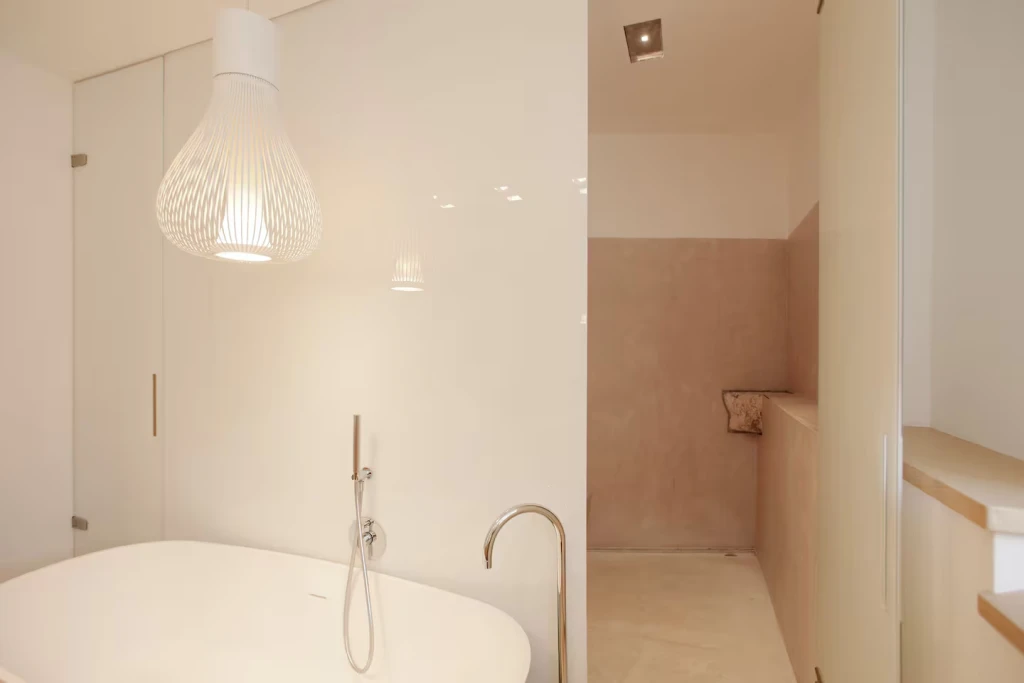 The residence is designed across three floors to balance shared living and private retreats. The ground floor hosts two living rooms, a dining room, a fully equipped kitchen with laundry, and the terrace with a shaded dining area — ideal for long lunches or evening meals outdoors. One of the three double bedrooms is also located here, complete with an en-suite bathroom and a private sauna. A small staircase leads to a shared bathroom for guests.