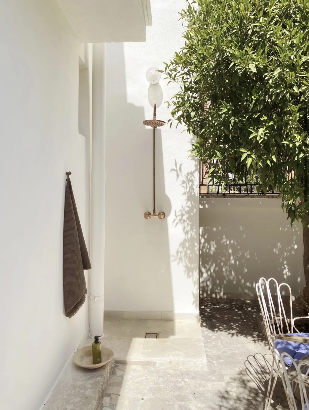 The villa is composed of two connected buildings, each with its own charm, joined by a sun-drenched terrace and lush garden. The main house spans three floors: a ground-floor lounge with rich red terrazzo flooring, a kitchen with open fireplace and mural-lined dining space, and a bedroom with en-suite bathroom and balcony overlooking the trees. Across the terrace, the second house — affectionately called Atelier a Mare — holds a second bedroom with private bathroom and views over the garden. An outdoor shower and terrace complete the summer dream.