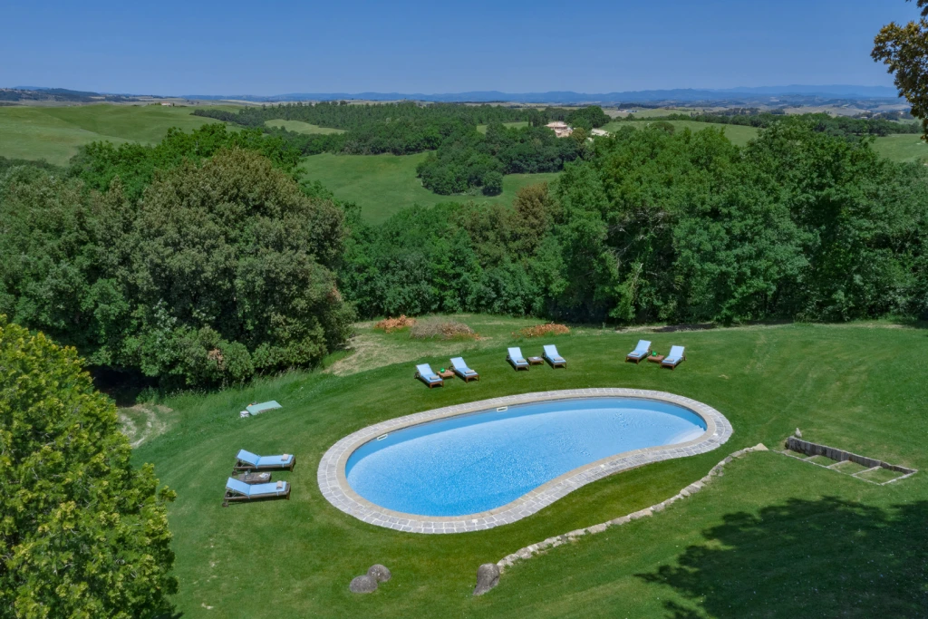 The villa lies in classic postcard Tuscany—south of Siena, close to medieval villages, renowned vineyards, and the iconic landscapes of the Val d’Orcia. It’s an ideal base for day trips: Siena with its grand piazza, the wine towns of Montalcino and Pienza, and miles of nature reserves and scenic roads that wind through this UNESCO-protected region.