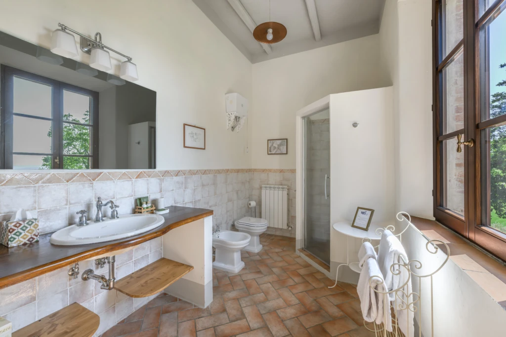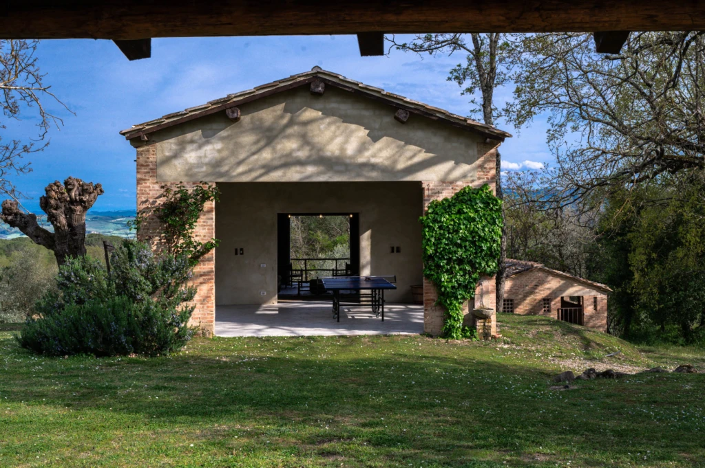 The villa can host up to 18 guests in 9 bedrooms. The main villa is divided into a North and South wing. The North wing features four bedrooms and three bathrooms on the first floor, with a large living room, dining area, and modern kitchen below. Picture windows open onto the garden, framing views of the Val d’Orcia, while a covered patio is perfect for al fresco dining.