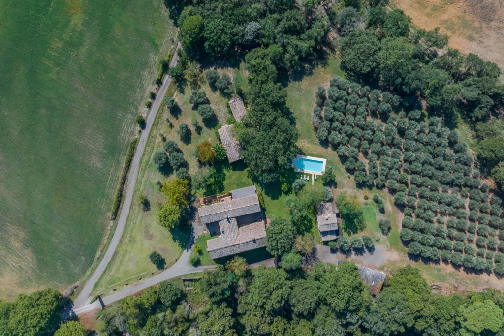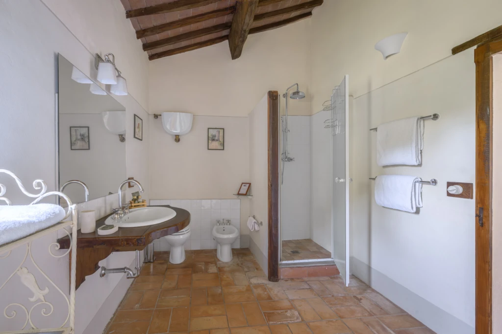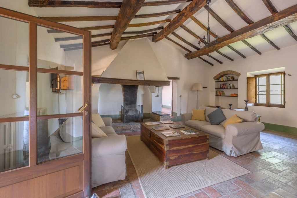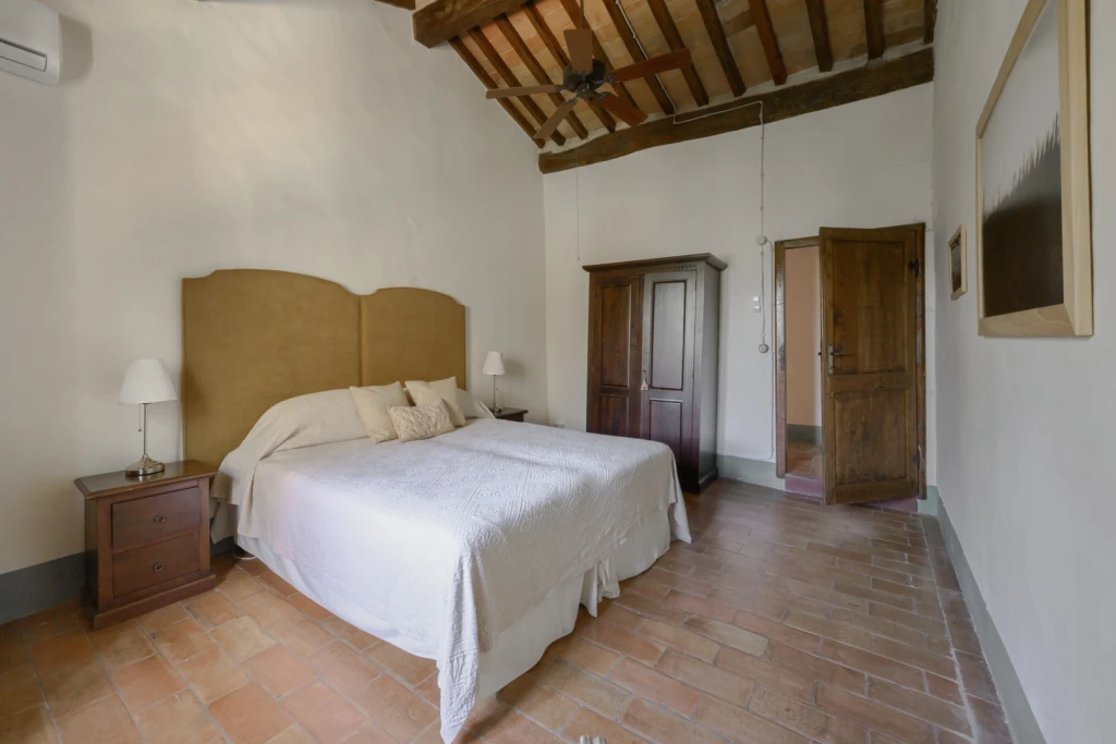 The South wing offers a distinctly Tuscan atmosphere with three to four bedrooms and three bathrooms, a generous living room with a wood-burning fireplace, and a traditional Tuscan kitchen. A loft-style master bedroom, double bedroom, and cozy living area complete the charm of the guest house, which overlooks the olive groves and the central pool.