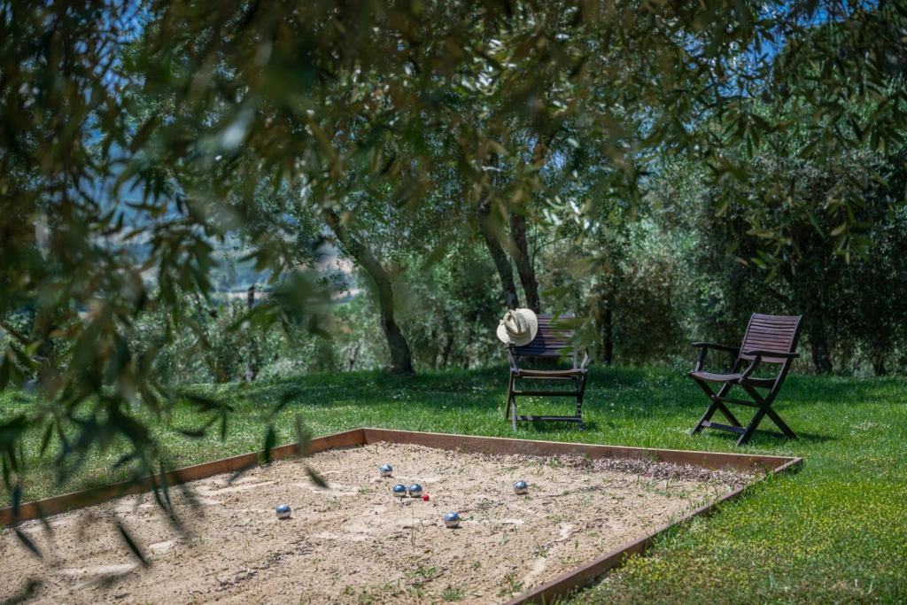 The borgo’s gardens are a haven for relaxation. A central swimming pool offers sweeping views of the valley and olive groves, while terraces, pergolas, and shaded patios provide the perfect spots for cocktails, reading, or sunset dinners. Outdoor games, including a bocce court, table tennis and basketball nets, add lighthearted fun to the serene surroundings. A wood barbecue is available for informal meals, while private in-villa dining can be arranged to enjoy local wines and Tuscan specialties.