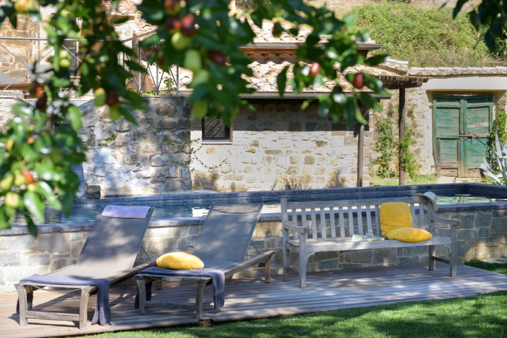 The property was completely rebuilt and restored in 2022–2023, preserving the essence of traditional Tuscan architecture while introducing modern luxury. A 1600m2 garden wraps the property, dotted with olive trees, flowering plants, and shaded areas for lounging. Outside, you’ll find a private pool (4m x 10m), a gazebo, a barbecue, and a traditional wood-fired pizza oven. Perfect for quiet afternoons in the sun, evening aperitivos, or a fun pizza night with family or friends.
