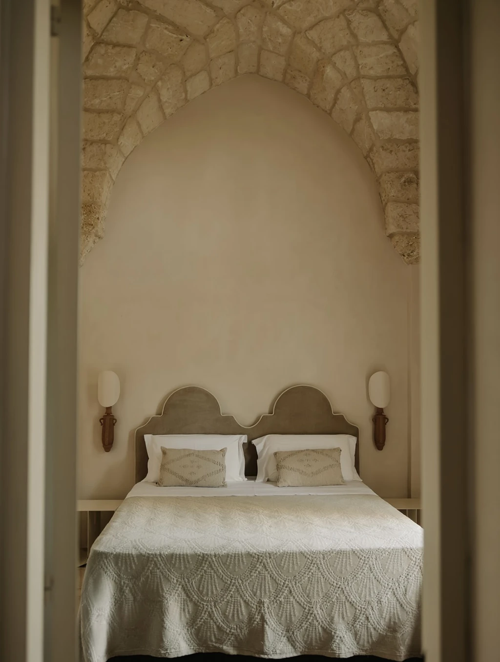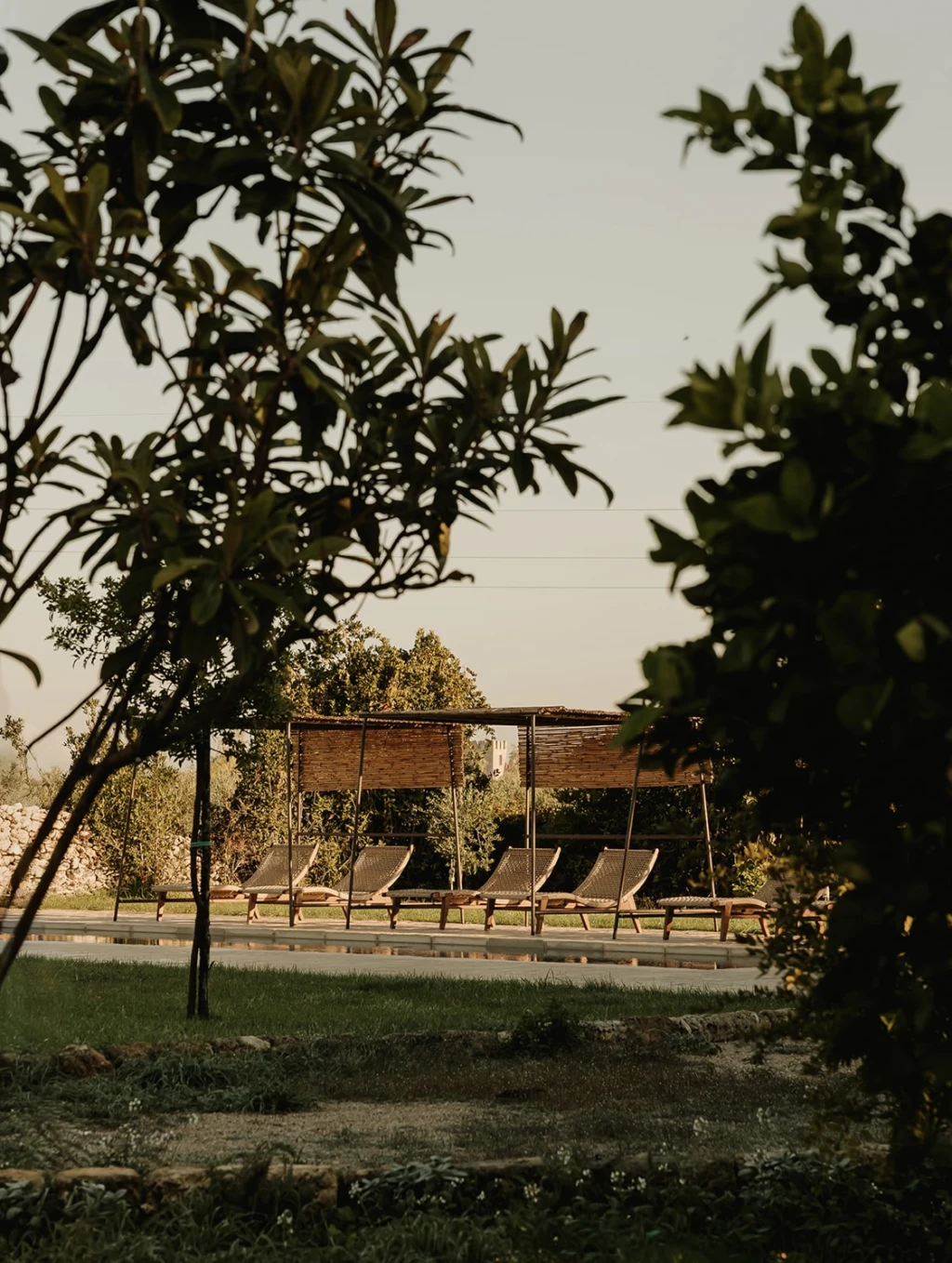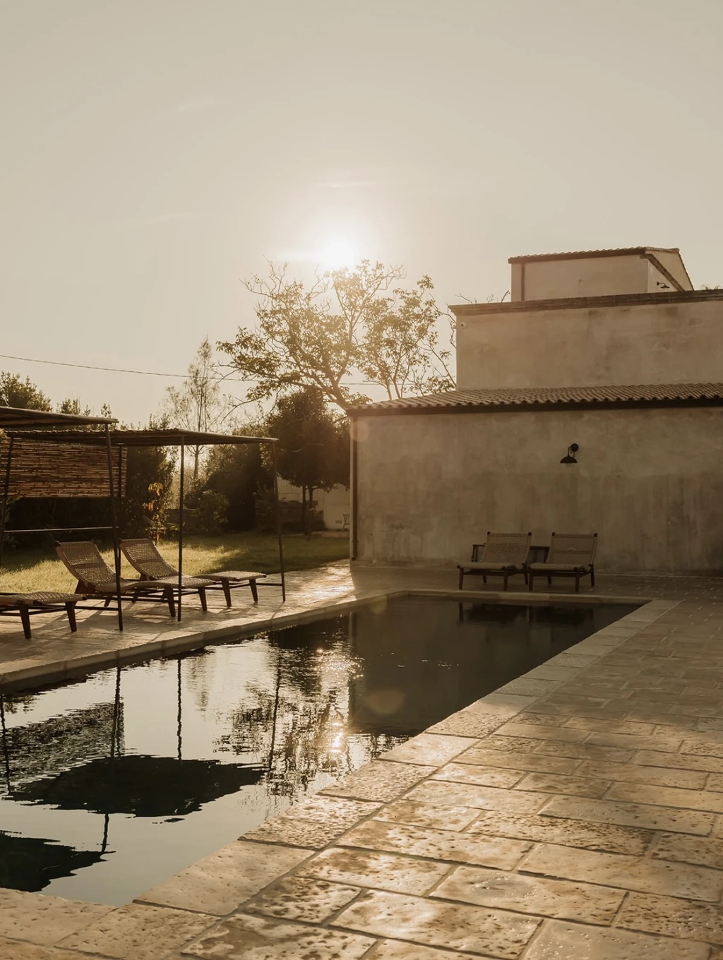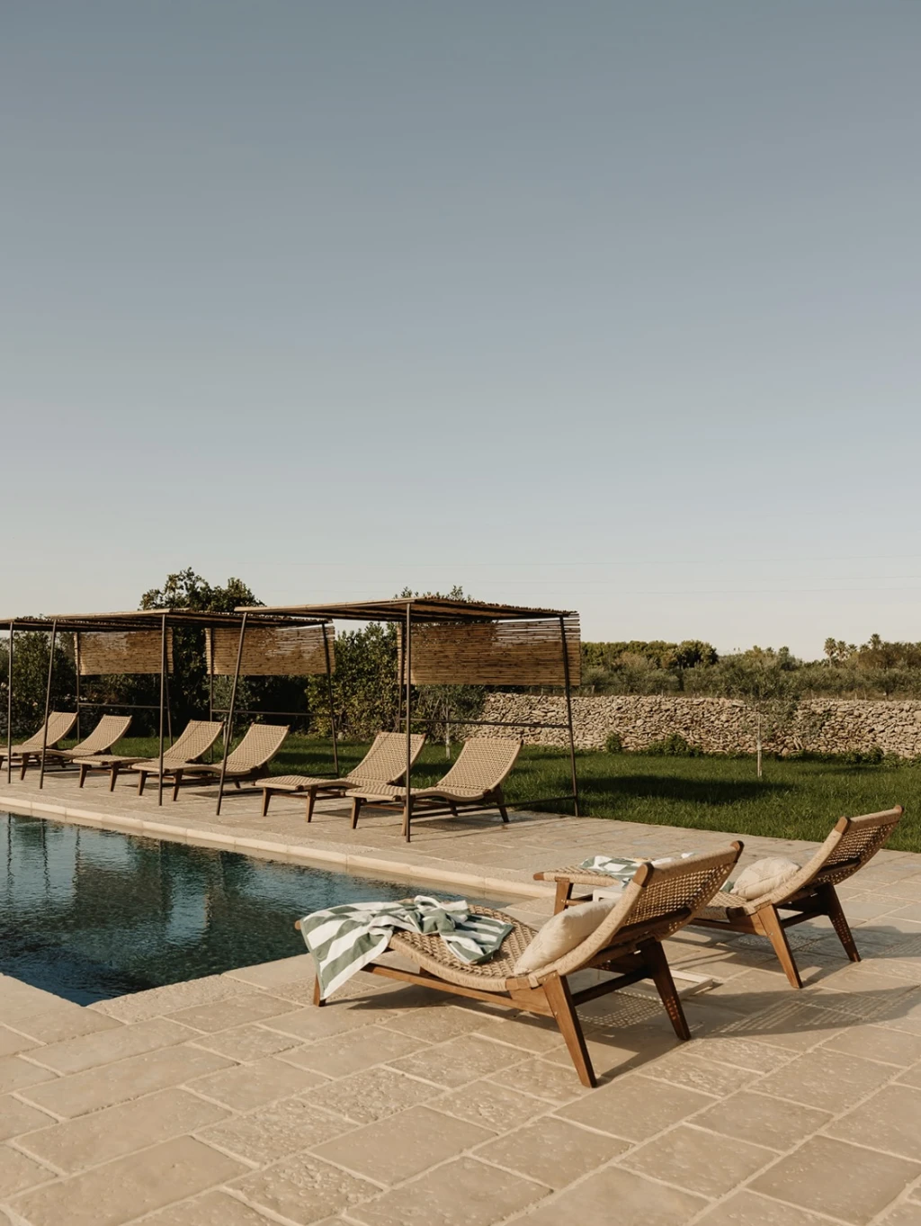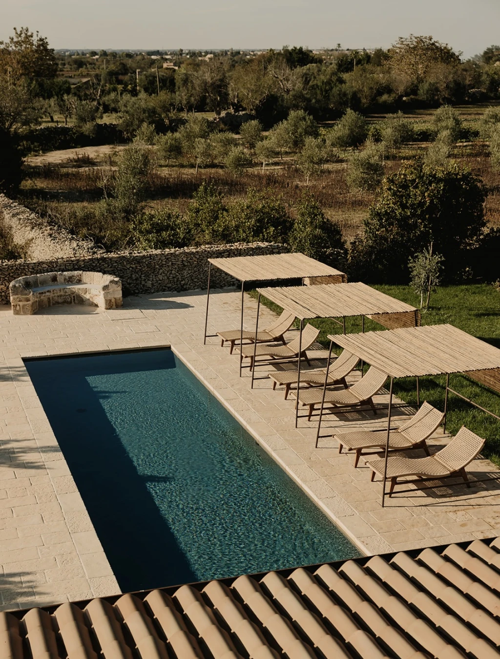 At the rear, a centuries-old walnut tree casts its shade over the terrace, the perfect setting for long lunches and late dinners. At the front, more than two hectares of enclosed parkland are filled with olive trees, citrus, and Mediterranean herbs. A private pool, tucked into this quiet landscape, offers a refreshing retreat through the long Salento summer.
