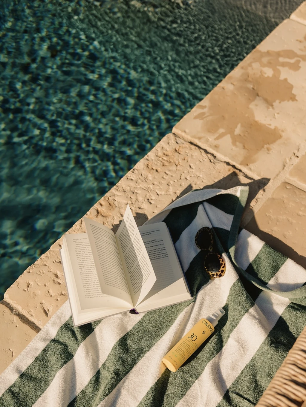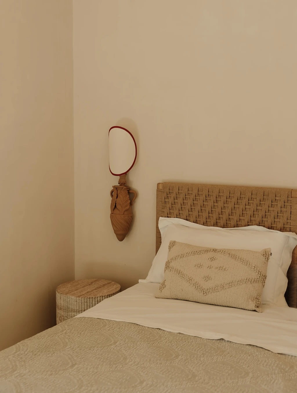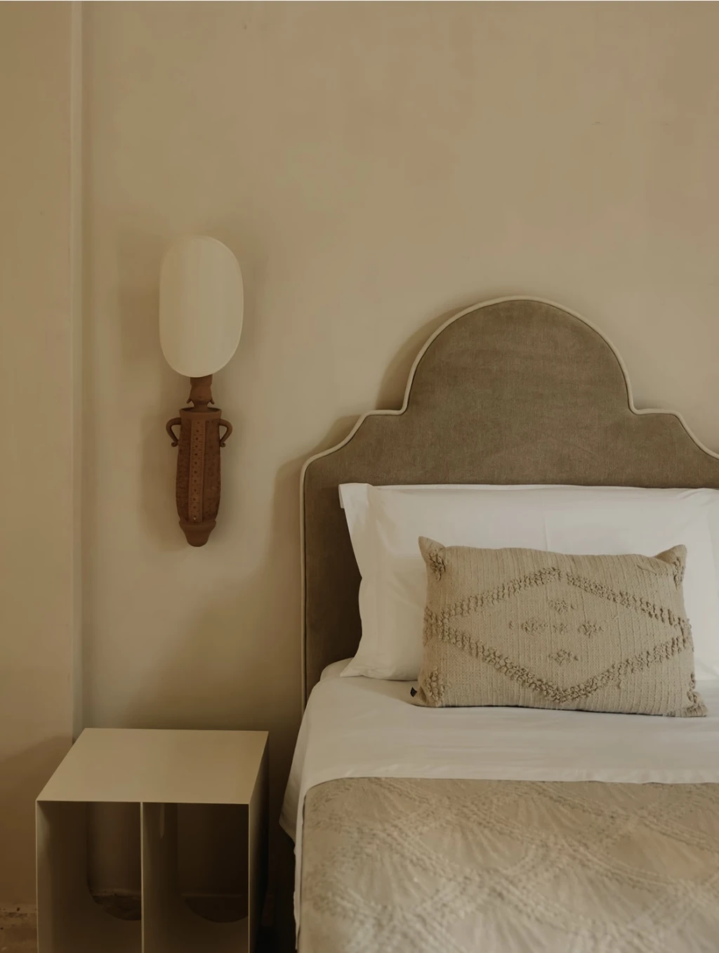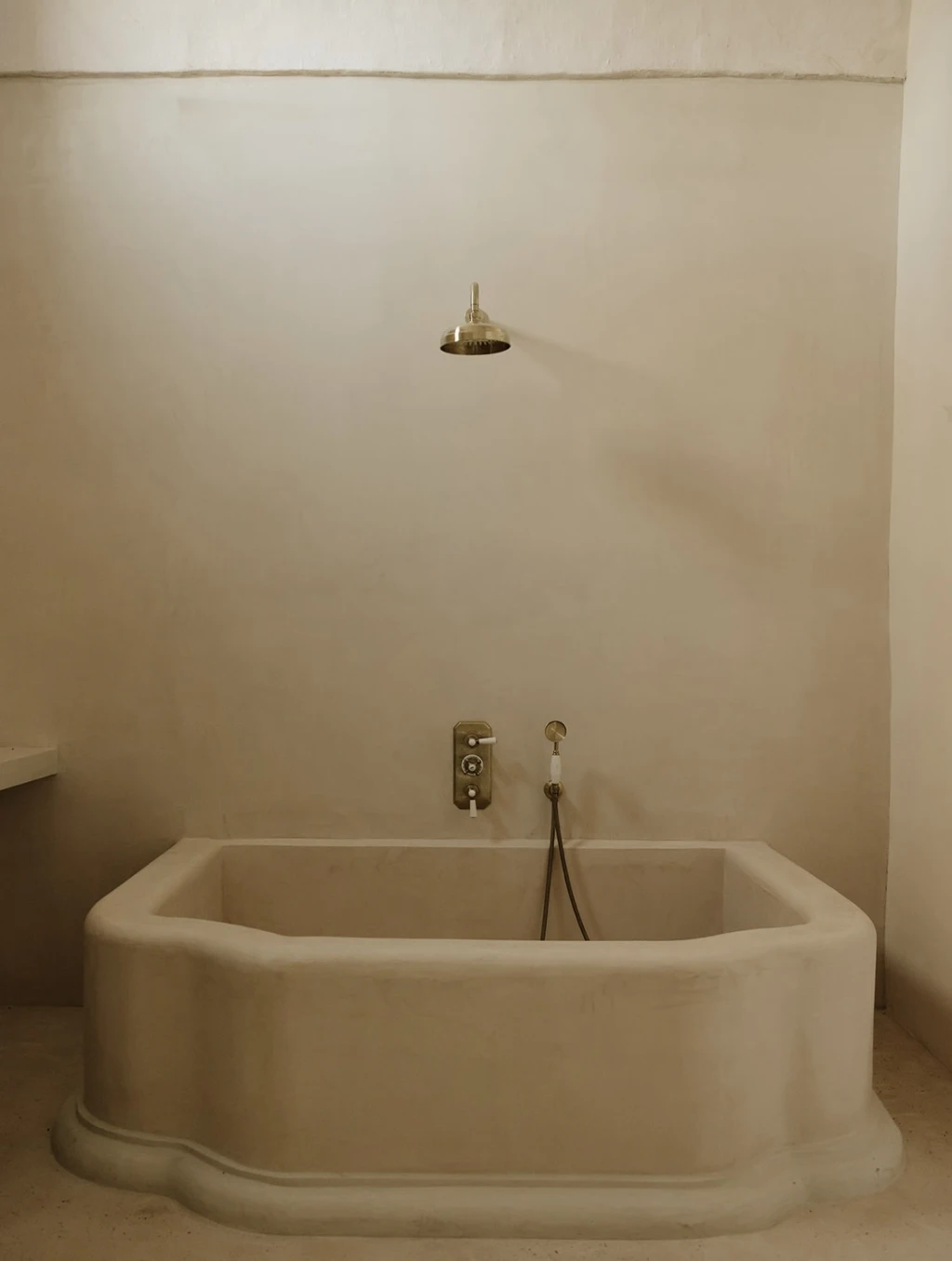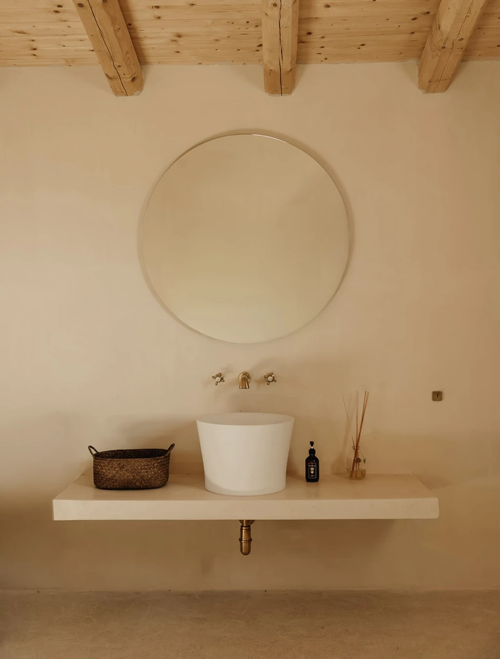The villa sleeps up to 10 guests in five bedrooms, each with its own bathroom. Rooms are luminous, simple yet elegant, with vaulted ceilings and windows that frame the garden or the parkland beyond. Every bedroom feels individual — a mix of historical details, contemporary pieces, and that particular softness of southern light.
