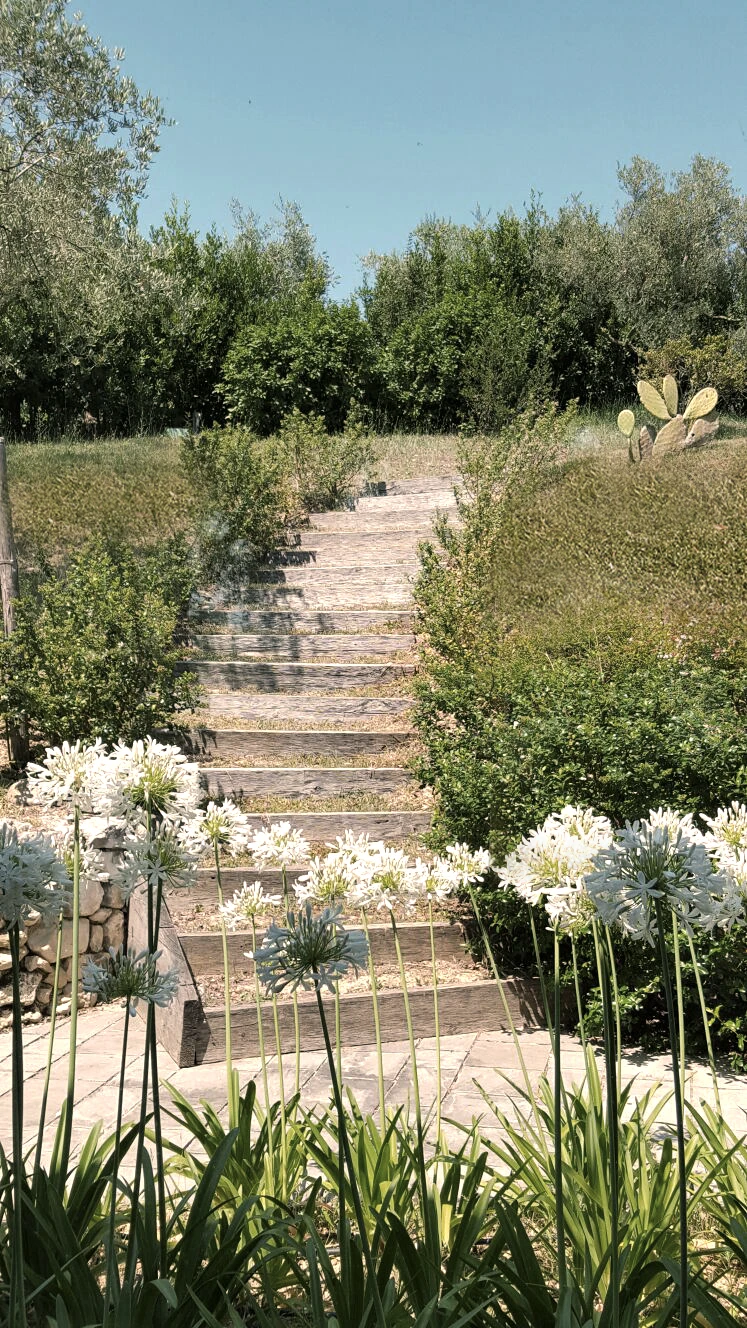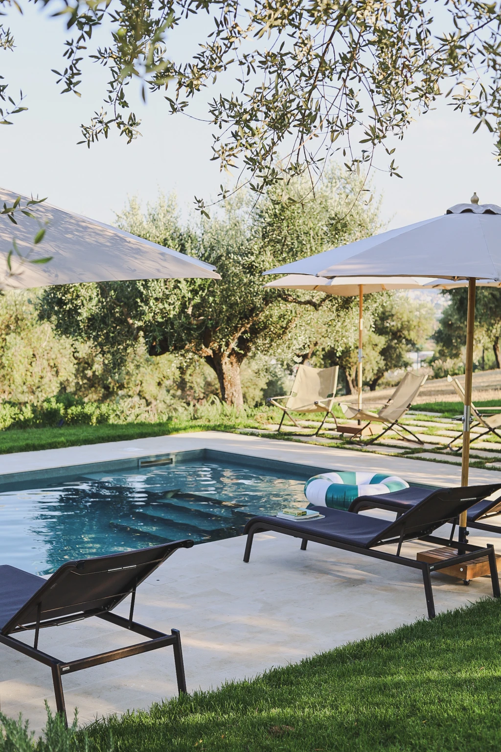 Outside, the property opens onto a landscape of centuries-old olive trees and open skies. The large, enclosed garden offers a peaceful setting for walks, reading, or simply enjoying the quiet. A covered terrace is perfect for breakfast in the morning or dinner at sunset, overlooking the grove and distant mountains. The estate spans five hectares of organic cultivation, ensuring privacy while remaining intimately connected to the surrounding nature. A friendly outdoor dog is present but can be kept separate if preferred.