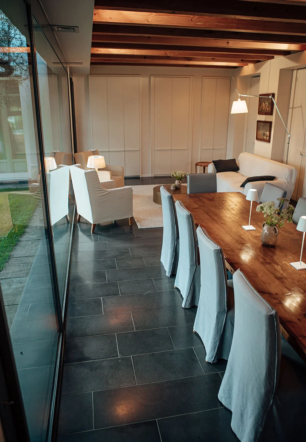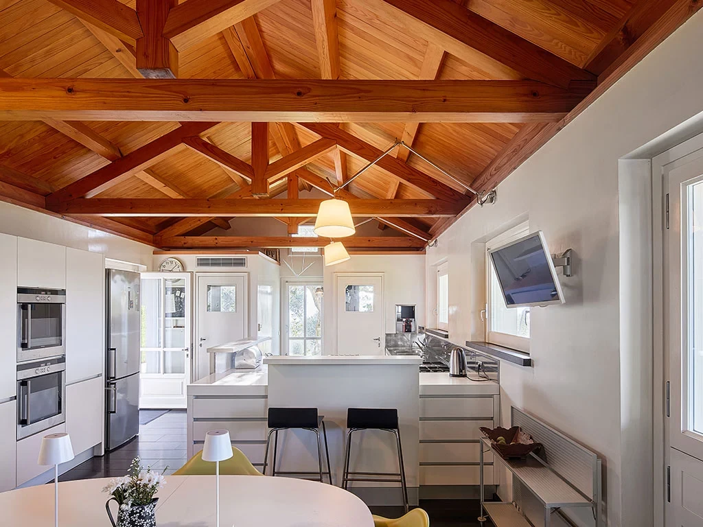 The bright ground-floor living area opens onto the terrace and garden, with comfortable sofas and armchairs for relaxing. The fully equipped kitchen connects naturally to the dining room, seating up to ten, perfect for long, convivial meals.