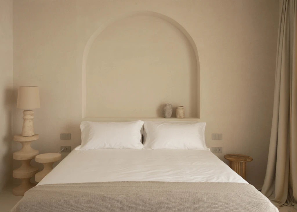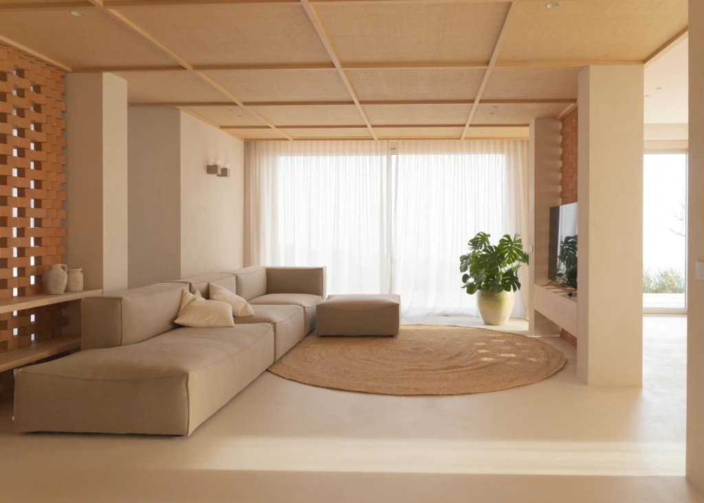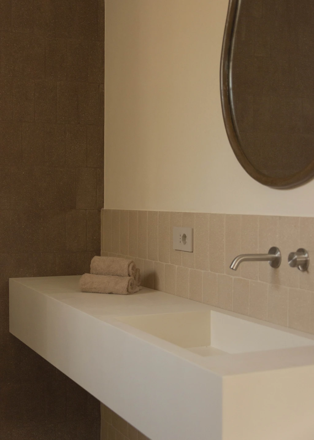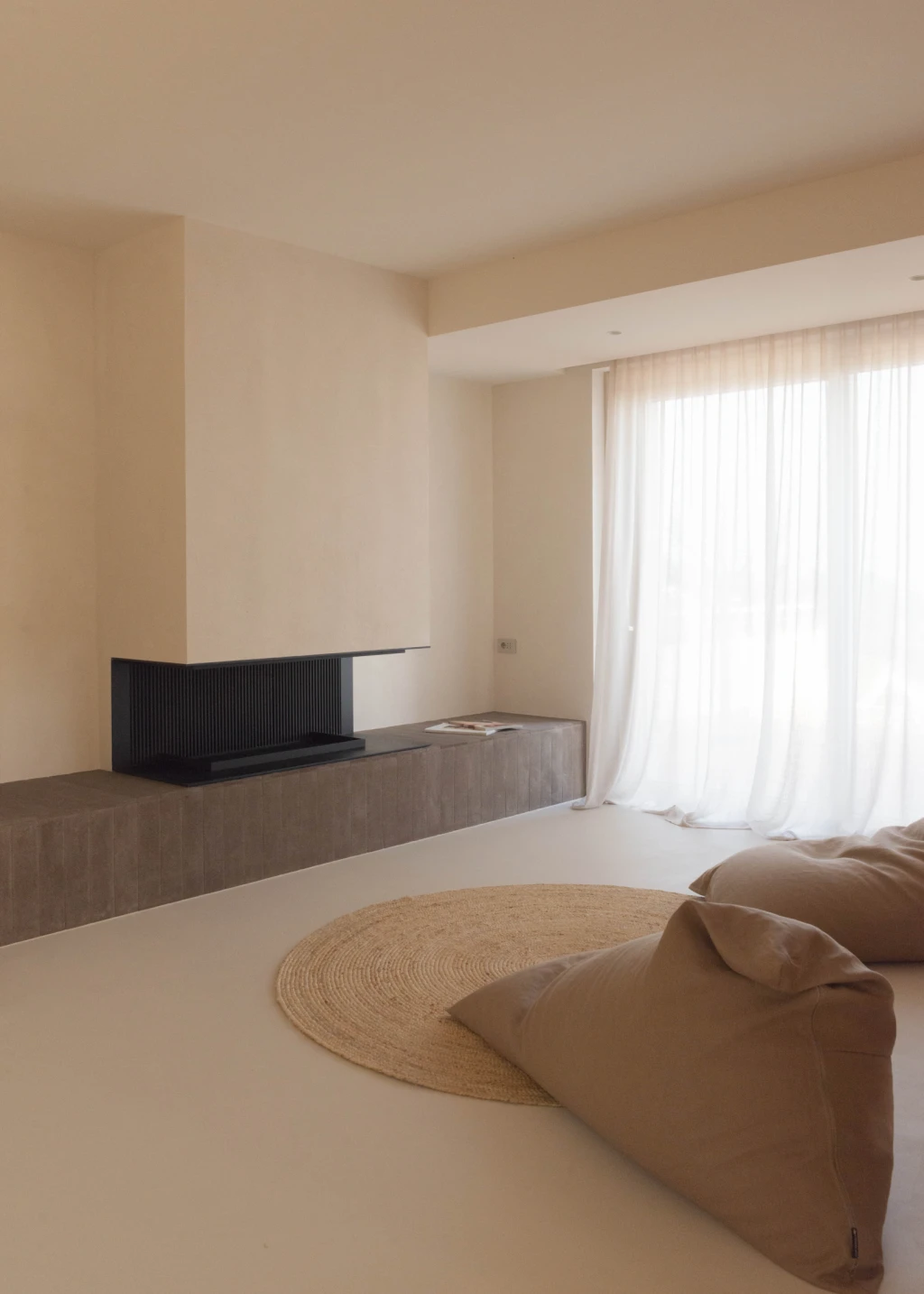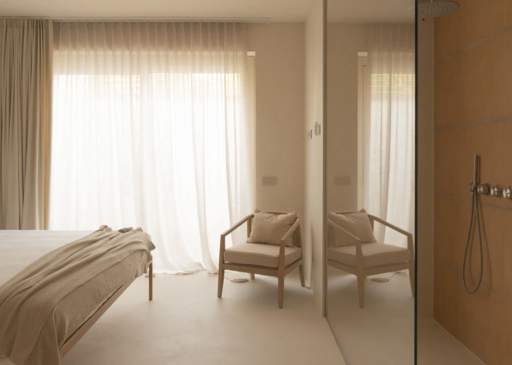 The house offers six bedrooms spread across three floors, each featuring artisan-crafted furniture, en-suite bathrooms, and private views over the hills or gardens. The open-plan kitchen is designed with a large bespoke island and high-end appliances, opening onto a terrace that is perfect for dining or relaxing while enjoying the view. Shared and private patios bring the outdoors in, while intimate corners invite quiet moments with a book or a glass of wine.