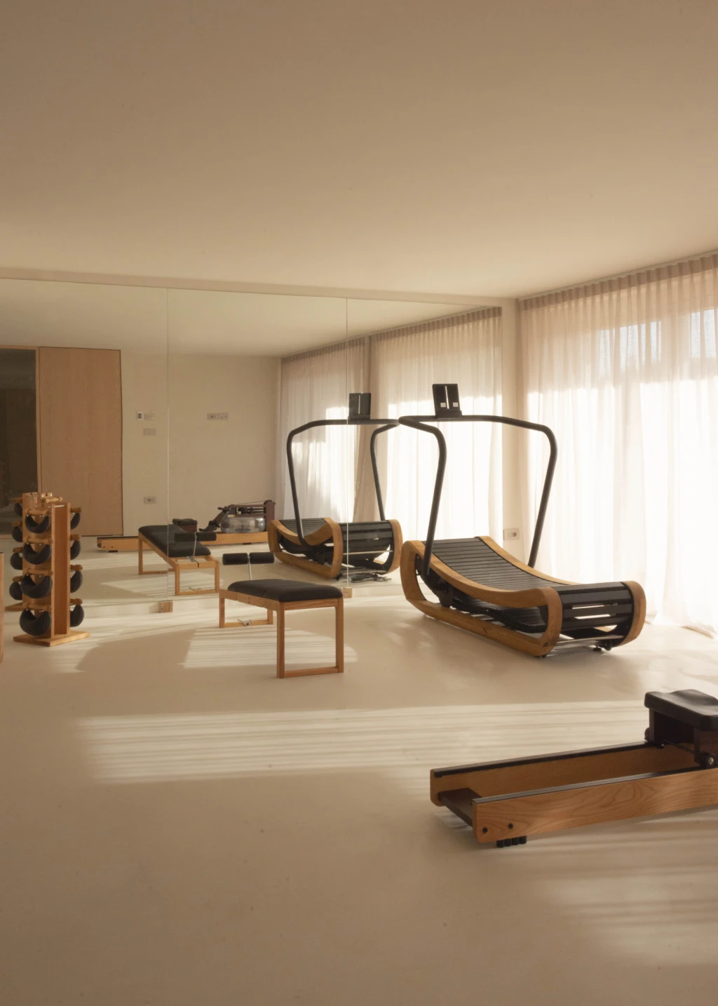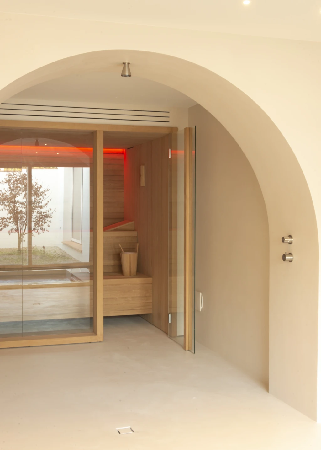 A dedicated wellness area in the basement includes a hydromassage tub, sauna, herbal tea corner, and a sound system for an immersive experience. Adjacent, the gym is equipped with a water rowing machine, weight tower, treadmill, and more, blending design and functionality seamlessly.