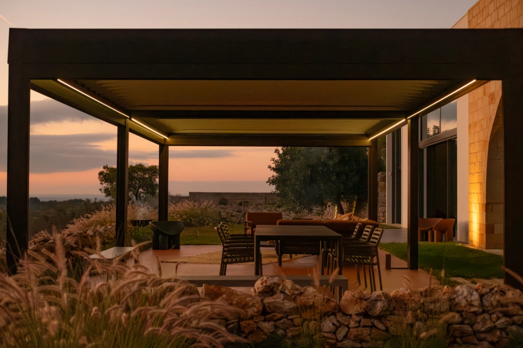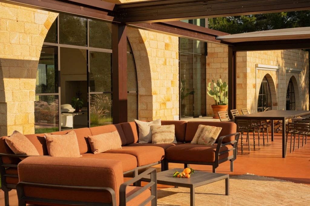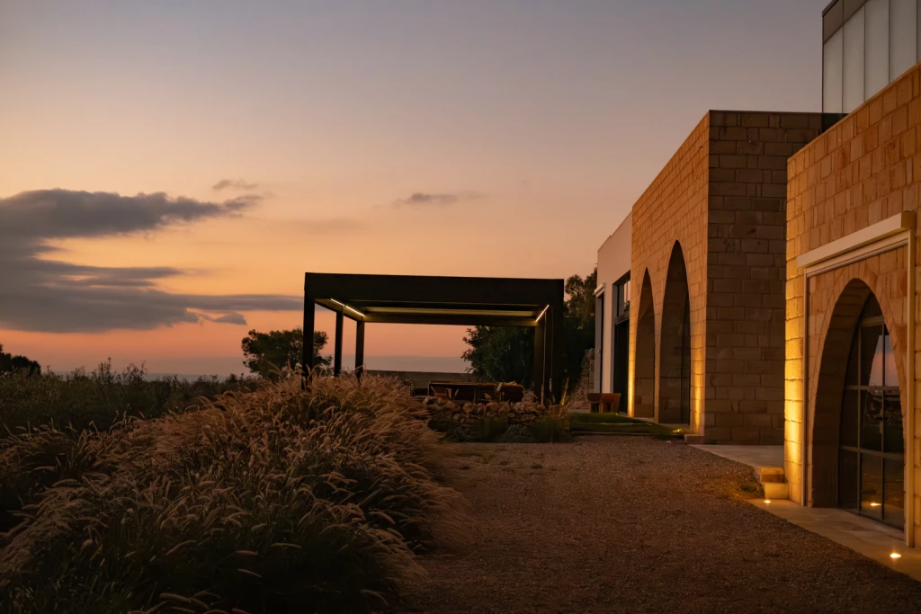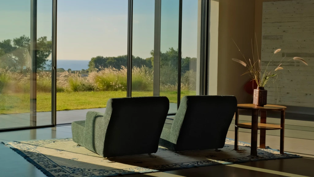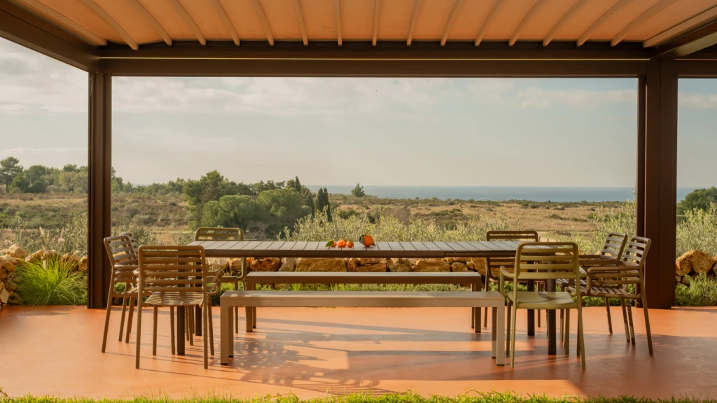 Outside, the architecture flows naturally into the landscape. Guests can enjoy shaded lounge areas beneath century-old pines, a large swimming pool set amidst the olive groves with sunbathing terraces, and a vegetable garden and orchard. Every room opens onto outdoor spaces, creating a seamless connection between interior and exterior living.