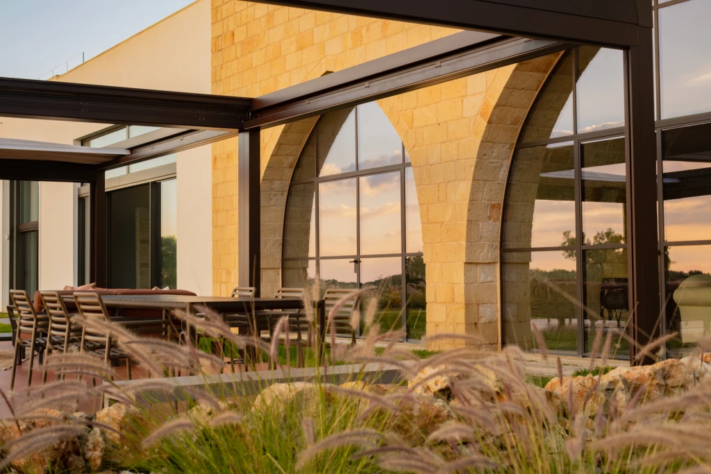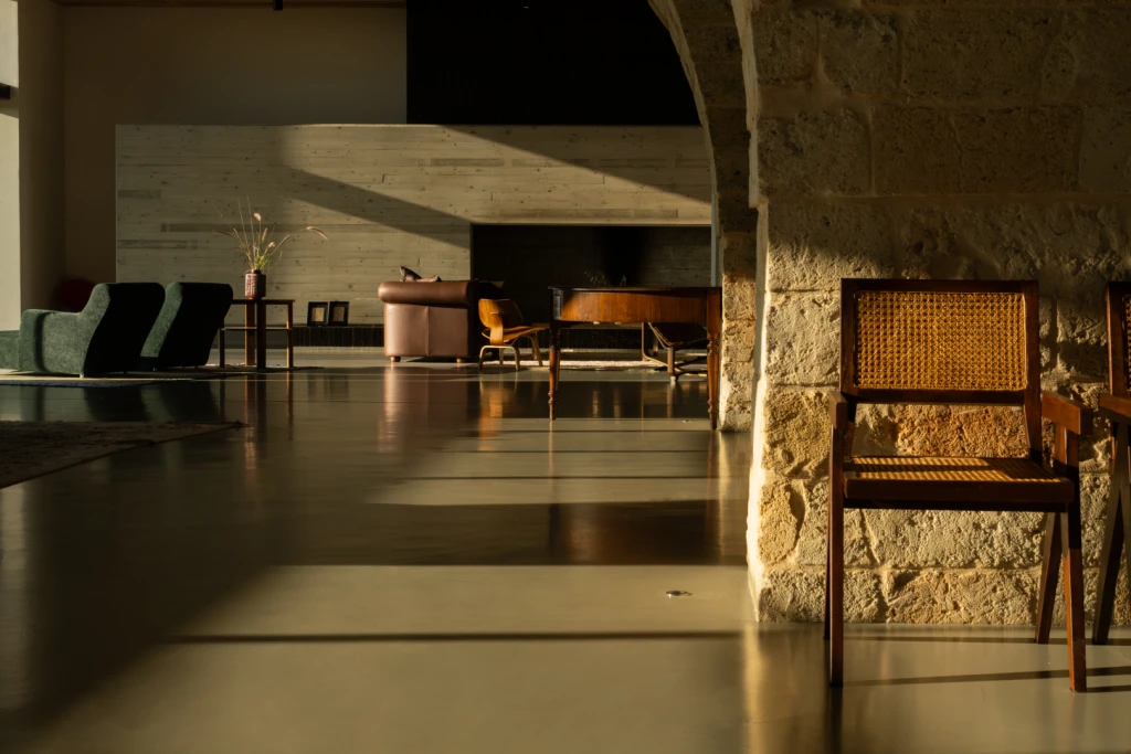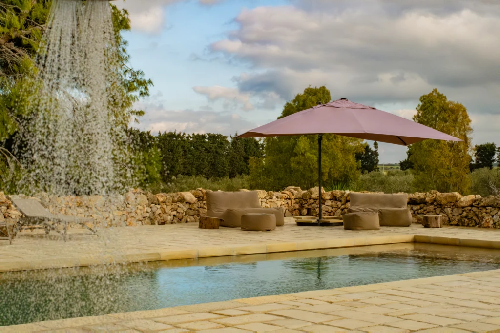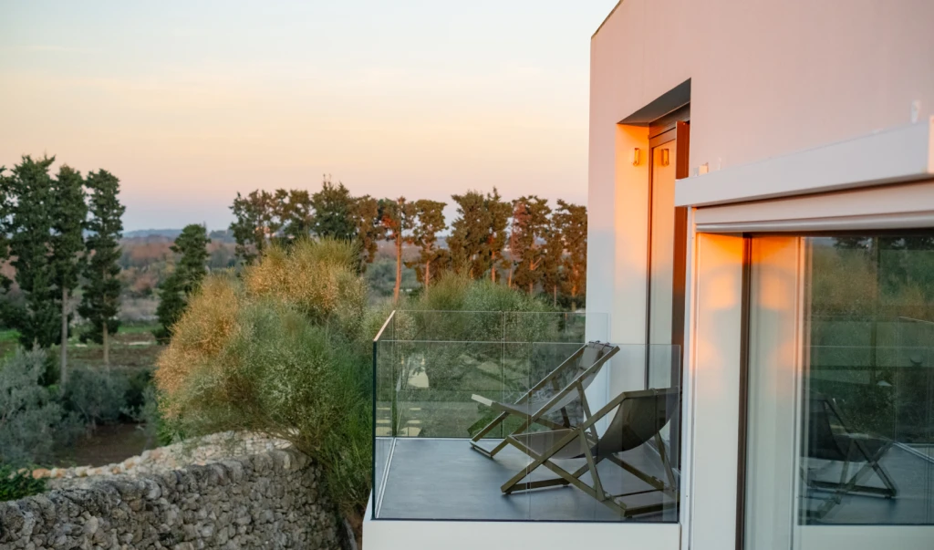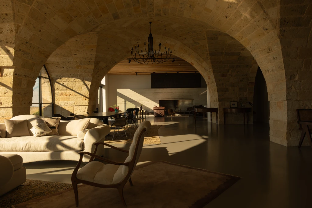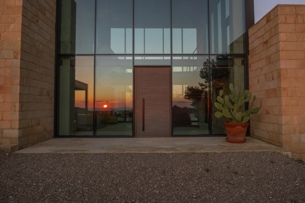 This historic Masseria, carefully restored by architect Cosimo Antonaci in collaboration with the owners, is a striking blend of past and present. The renovation preserves the original stone structure while seamlessly integrating contemporary materials—exposed concrete, reclaimed timber, and local stone—creating a serene dialogue between history and modernity. A signature glazed “tower” atrium connects the two historic wings, inviting natural light and offering uninterrupted views of the surrounding landscape.