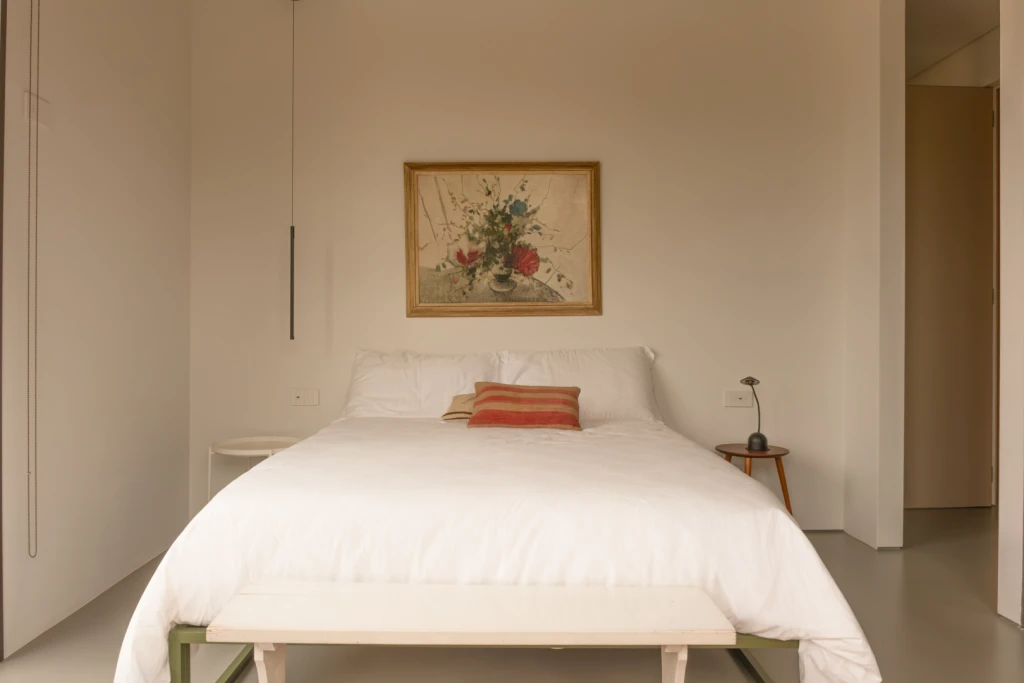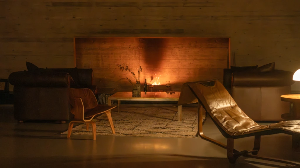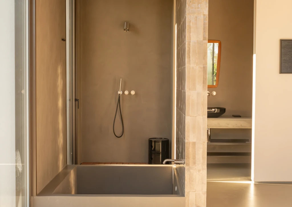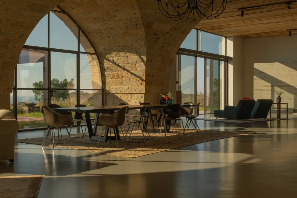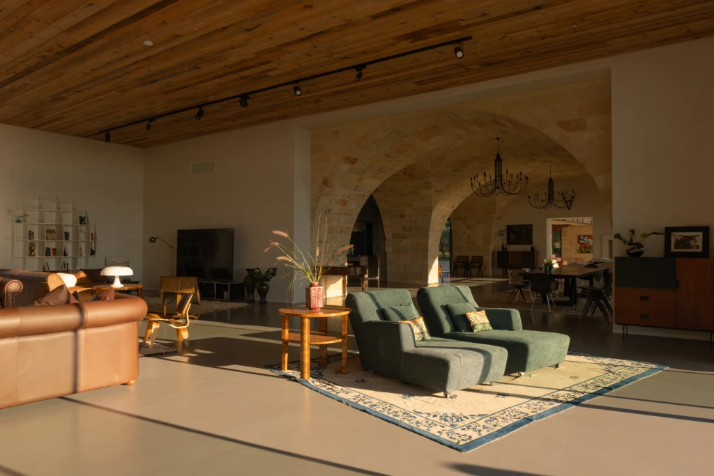 The Masseria accommodates 8 luxurious suites, each with en-suite bathrooms, walk-in showers or bathtubs, dressing areas, and private gardens with outdoor showers. Three suites additionally include private living areas. Interiors blend Scandinavian vintage pieces with iconic modern design and a curated collection of antique and contemporary art, enhanced by authentic textiles such as Beni Ourain and Persian rugs. The main living area offers multiple lounge zones, a dining area for 16, and two fireplaces, including a monumental concrete feature. A large open kitchen with stone islands and handcrafted cabinetry completes the space.