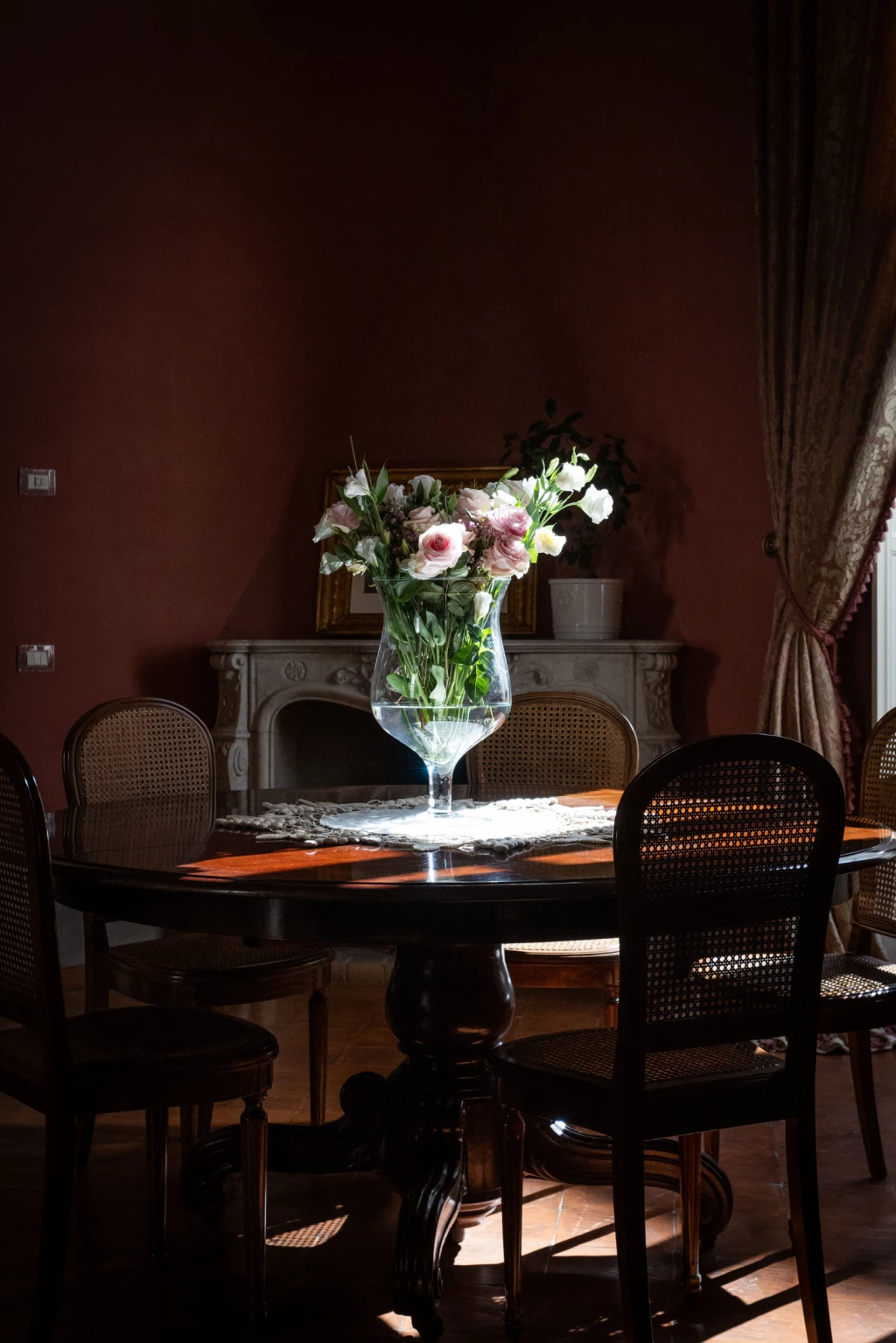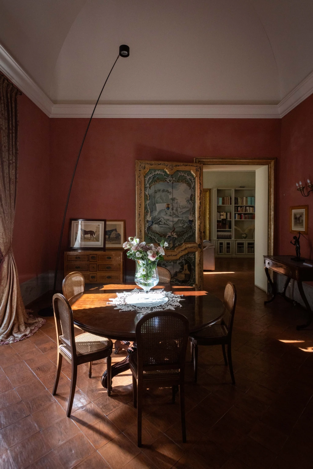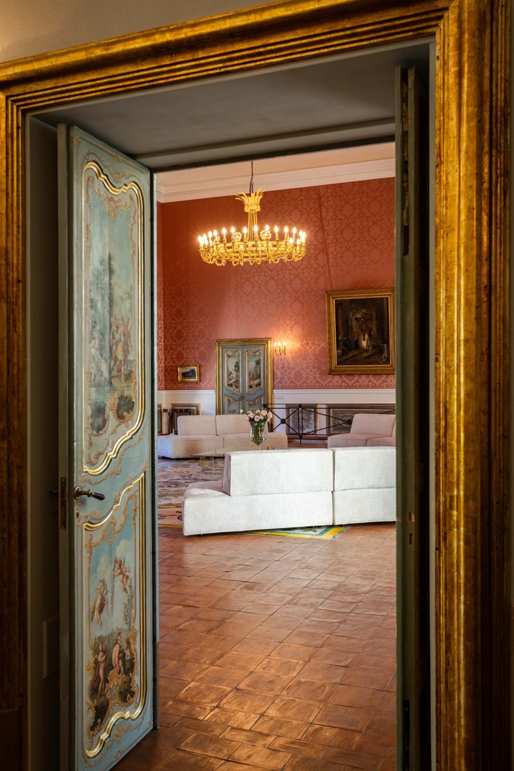 Two magnificent reception rooms define the heart of the home, each retaining its original proportions and architectural details. Antique doors frame the rooms, while one salon is anchored by a remarkable signed 18th-century majolica floor, still intact and quietly commanding.