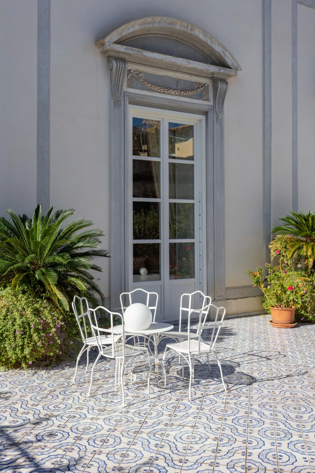 One of the palazzo’s rare privileges is its expansive terrace — nearly 300 square metres, paved in porcelain maiolica tiles. Sheltered by elegant drapery and framed by lush greenery, it becomes a natural extension of the living space.