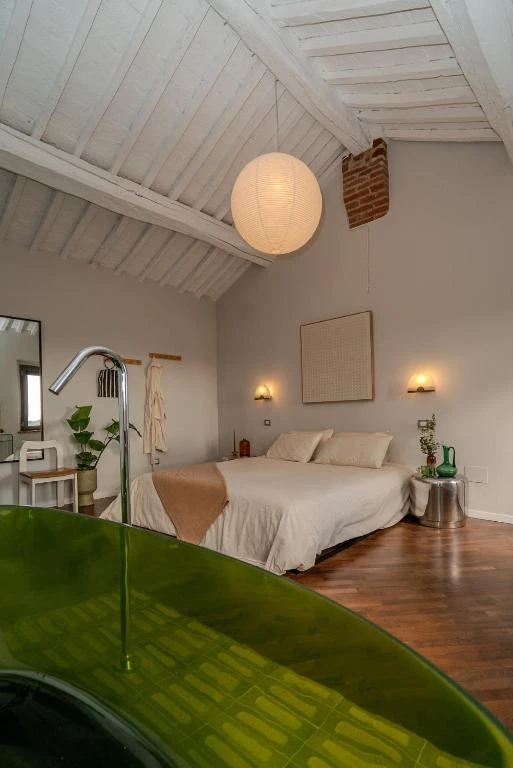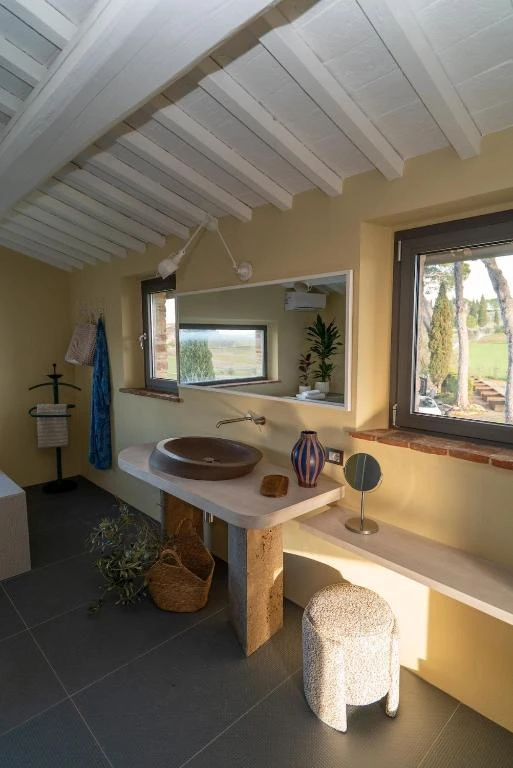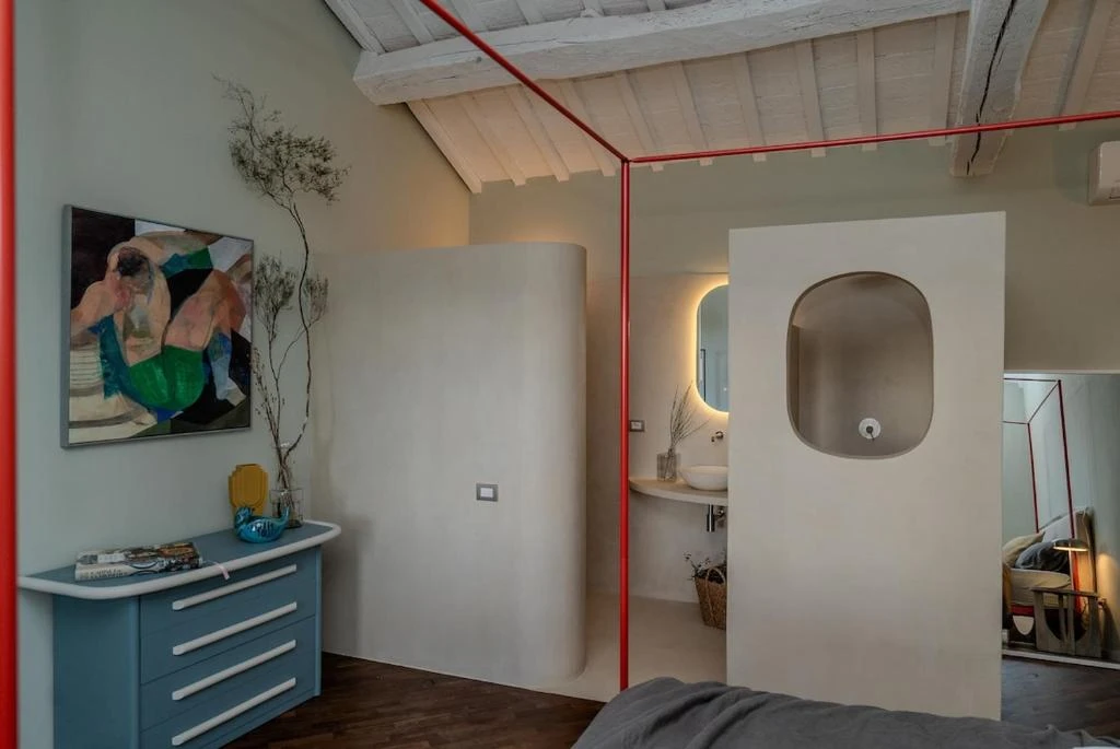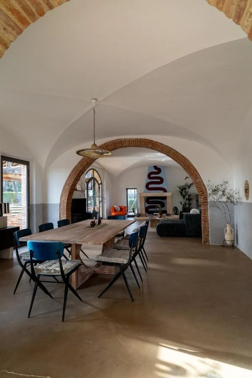 Inside, the villa feels like a gentle conversation between eras. Vintage pieces and contemporary design sit alongside original farmhouse features; custom furniture crafted by local artisans in wood, stone, and metal brings texture and soul to every corner.