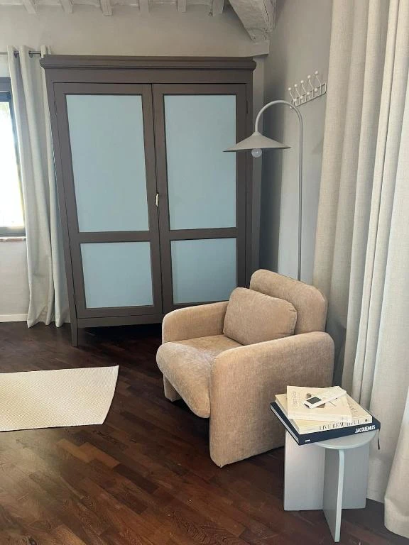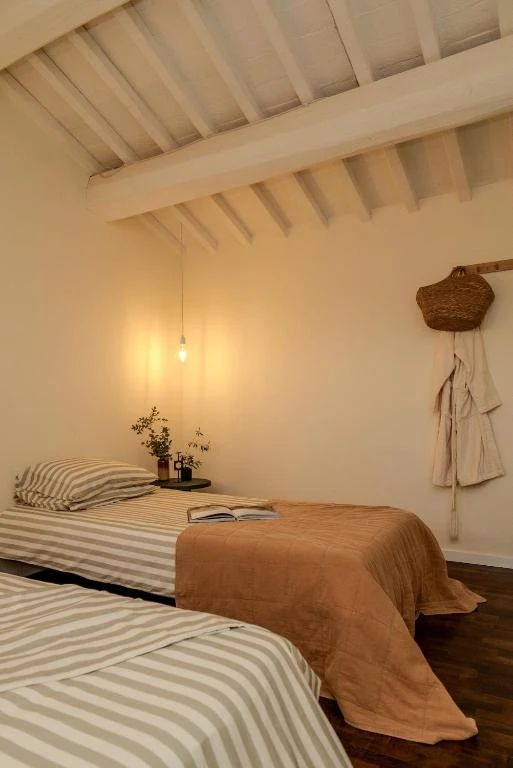 Across the villa, up to sixteen guests can settle into rooms that feel warm, characterful, and each slightly different in personality. Soft wallpapers, carefully chosen textiles, and antique touches make every space feel personal rather than polished.