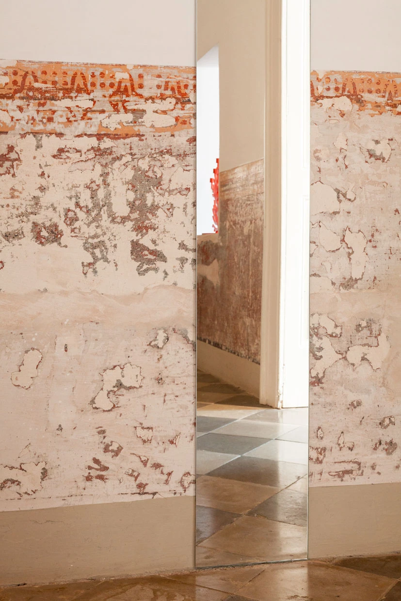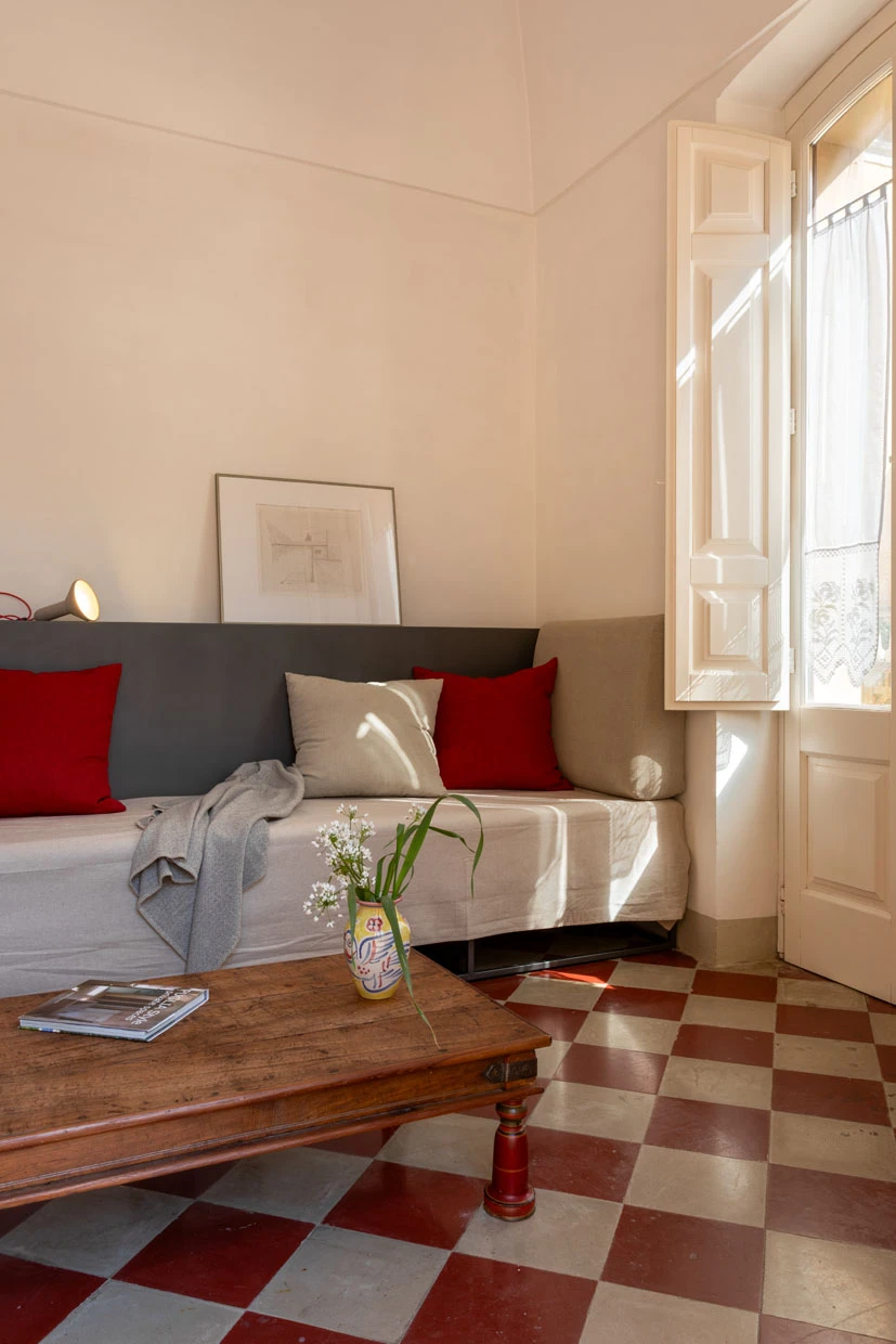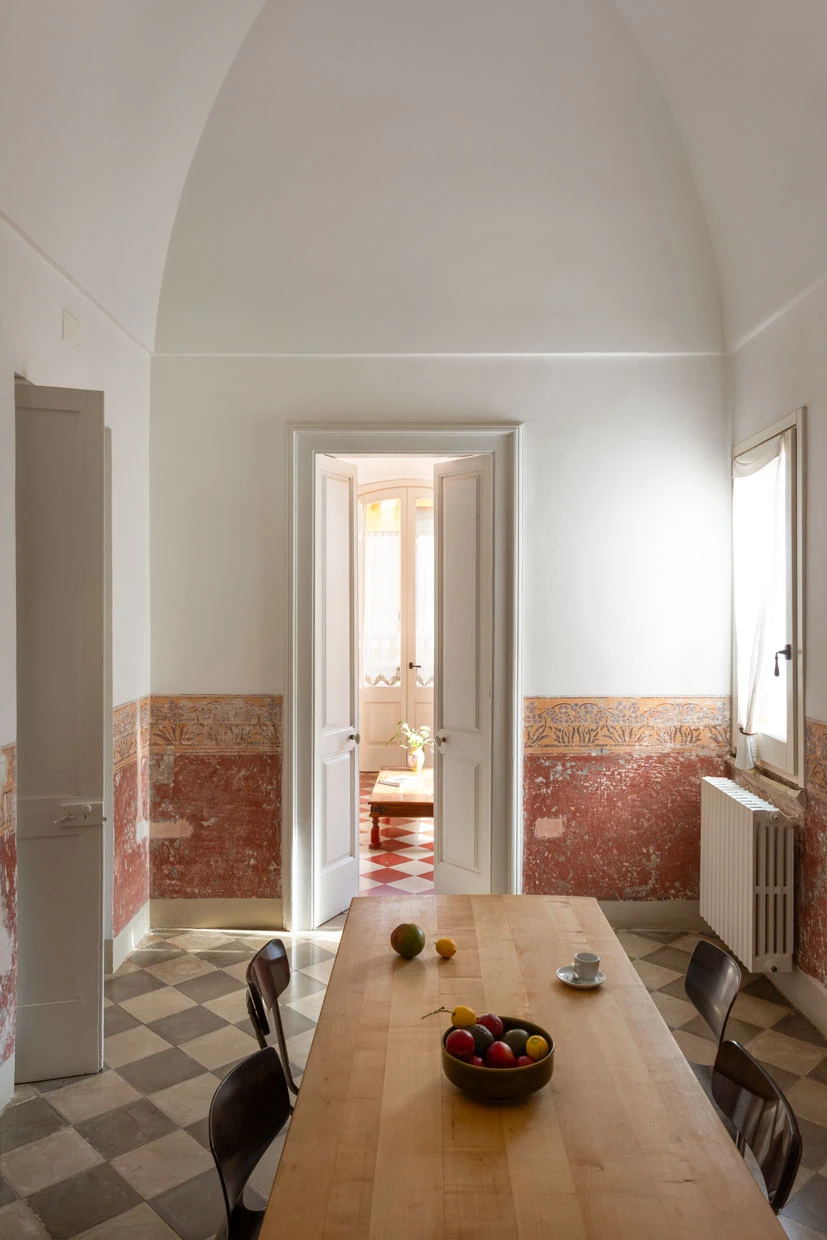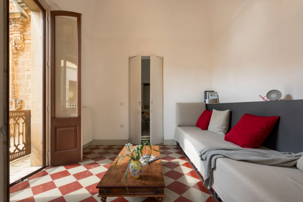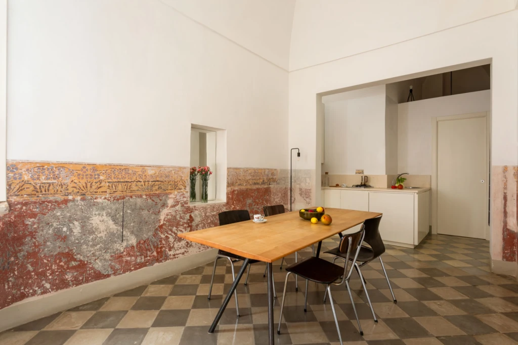 On the first floor of a 17th-century palazzo Nobili, this apartment is a quiet retreat tucked into the historic heart of Galàtone. Originally part of an extension to the small church of San Giovanni Battista, the space has been lovingly restored to highlight its original character: antique iron railings, painted murals, old tiles, and original coffered doors all speak of a rich past. The soaring 6.5-meter “volta a stella” ceilings — a traditional star-shaped vault — crown the bedroom, dining, and living areas, creating a light-filled, airy atmosphere that feels both grand and intimate.