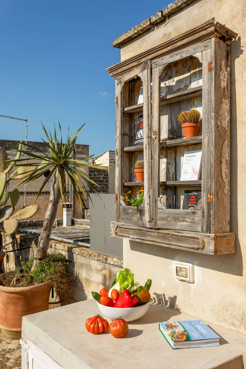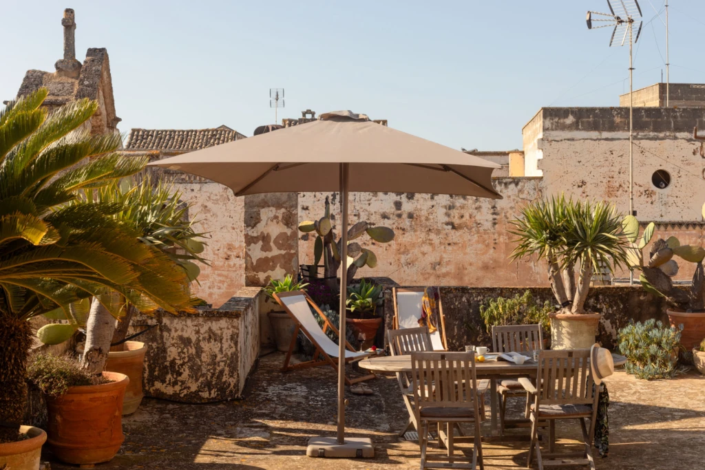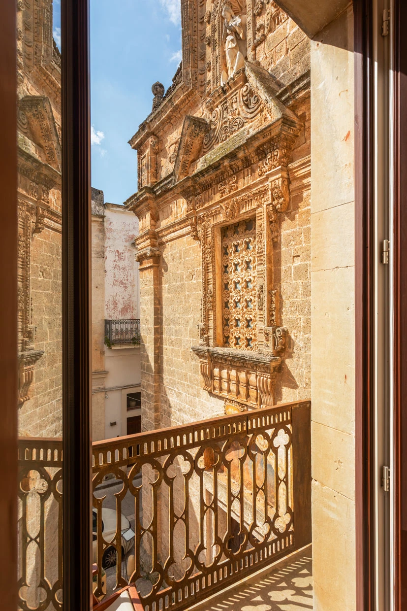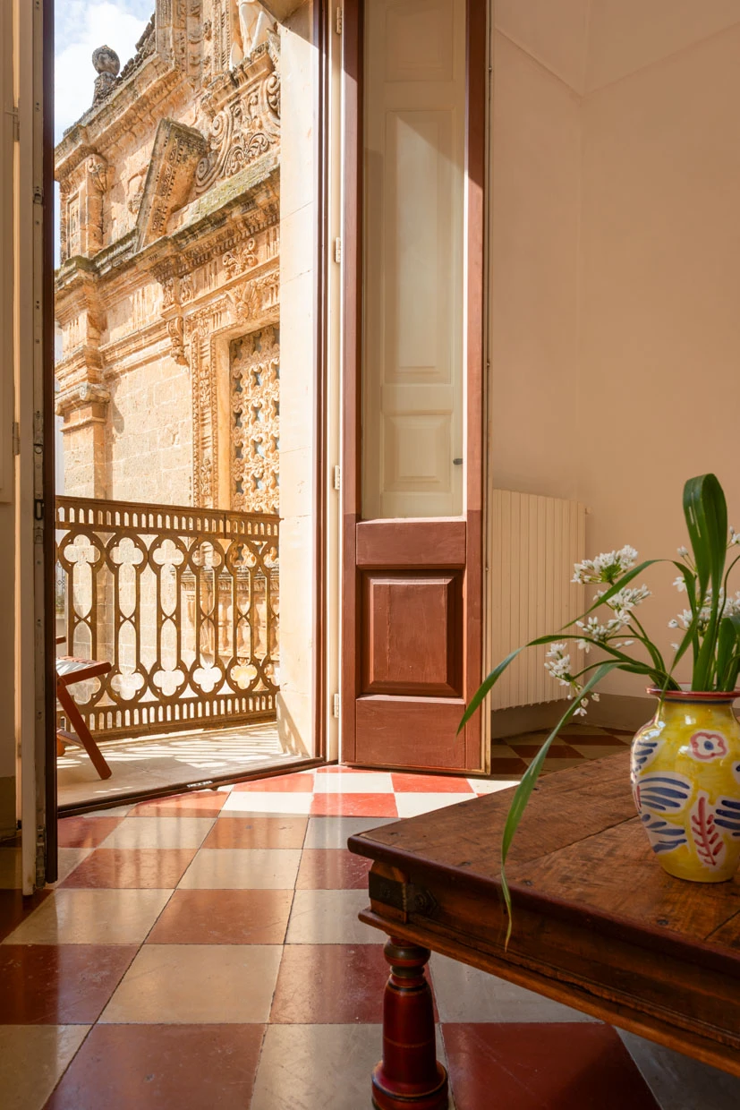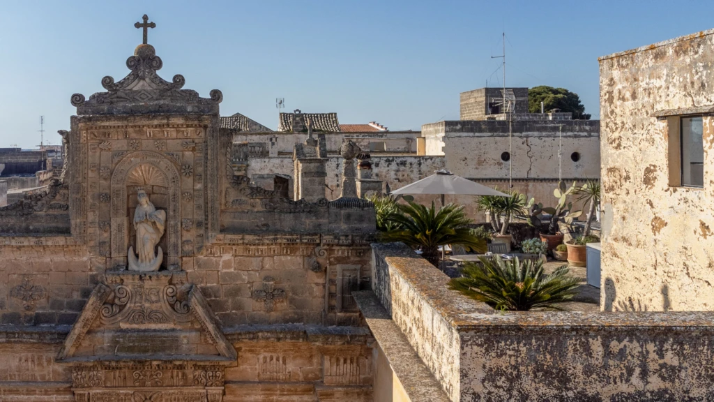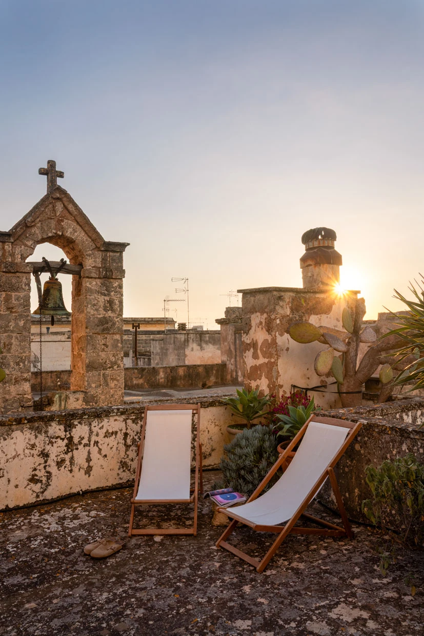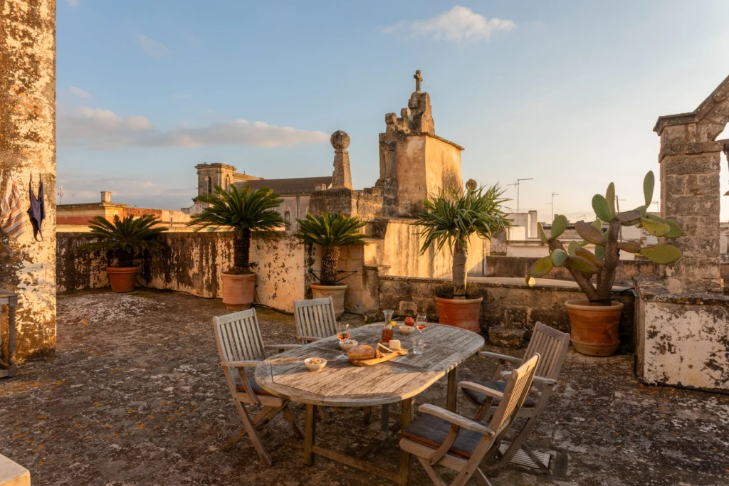 Two balconies offer glimpses of the old town, while a 70-square-meter rooftop terrace with a summer kitchen becomes the centerpiece. From breakfast to sunset, the view stretches over Galàtone’s terracotta rooftops and four churches, creating a quiet panorama that feels suspended in time.