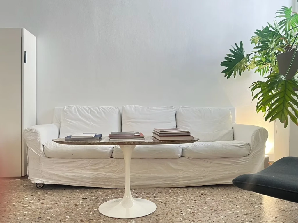 The apartment is furnished with a sofa by Alvar Aalto and a bed by Carlo Scarpa. The artworks are by Sergio Sermidi, Edward Habicher, and Carlo Ferraris.