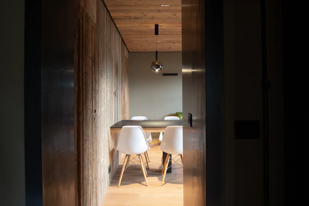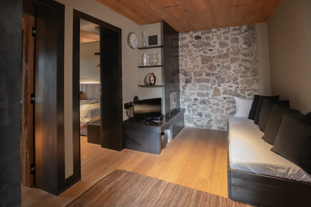 Constructed using the traditional Blockbau technique of interlocking tree trunks, the structure stands as a testament to the time-honored craftsmanship of the Lumiei Valley. The interior, a harmonious blend of dark slate, wooden floors, raw stone walls, and waxed tin panels, complements the minimalist contemporary furnishings, creating an atmosphere of rugged charm and modern simplicity. Each apartment, including the cozy Dolce Vita with its additional sofa bed, features an open-plan living area with a fireplace, kitchenette, and dining area, seamlessly connecting the indoors with the breathtaking Alpine outdoors.
