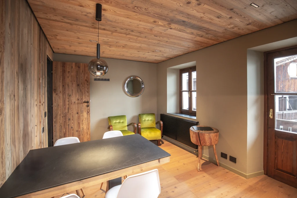Nestled in the enchanting hamlet of Sauris di Sopra, this historic home offers a holiday retreat that whispers tales of hospitality's alchemy through a house and four distinct apartments. This cherished residence, dating back to the late 19th century and once the home of Giuseppe, has been thoughtfully renovated by his great-grandchild. Each of the four floors, housing one apartment each, embodies a unique aspect of human experience: the grounding body, the emotional heart, and the reflective mind, each with its unique spirit yet identical in spatial arrangement and amenities.