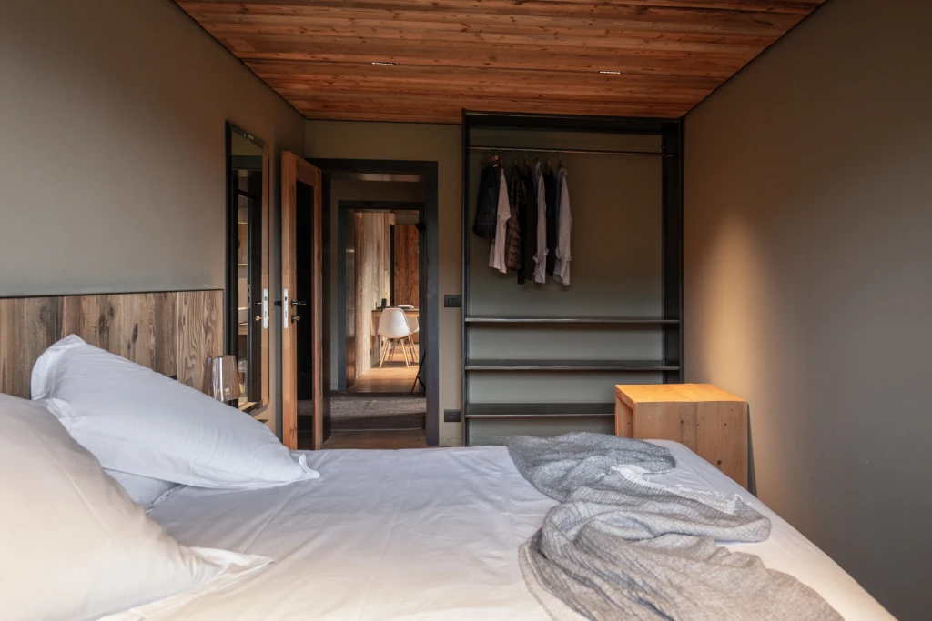 Utilizes traditional Blockbau construction, blending ancient and modern designs for a cozy, contemporary alpine retreat.
