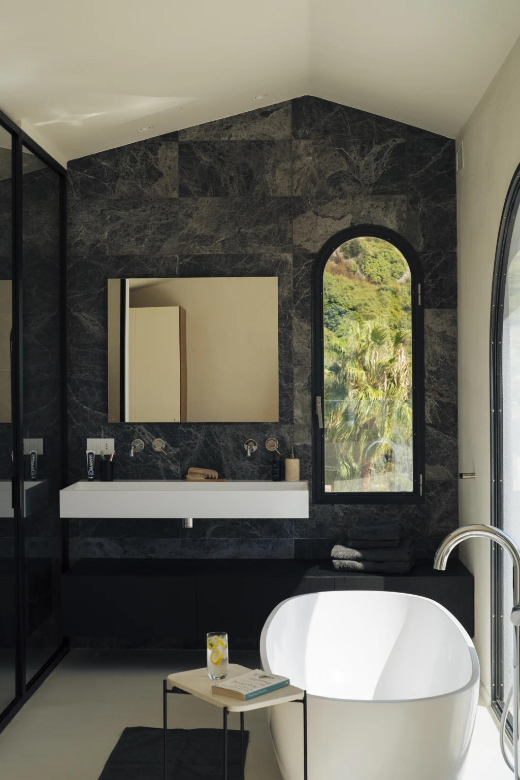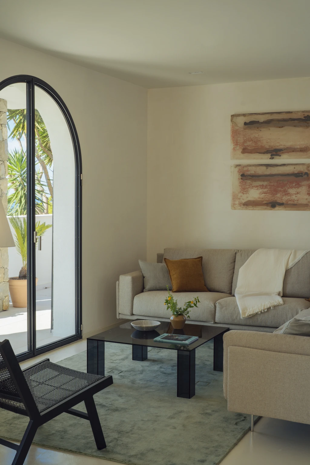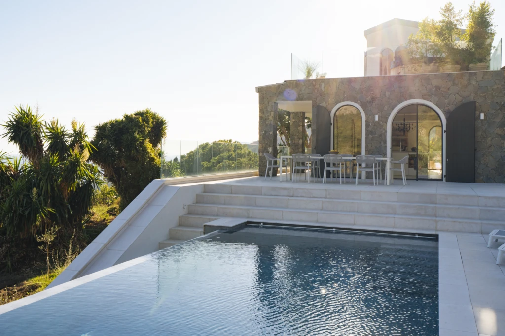The villa has been completely rebuilt in the same architectural style but with a strong focus on sustainability. It features underfloor heating, solar panels, a home battery, an EV charging station, and state-of-the-art insulation.