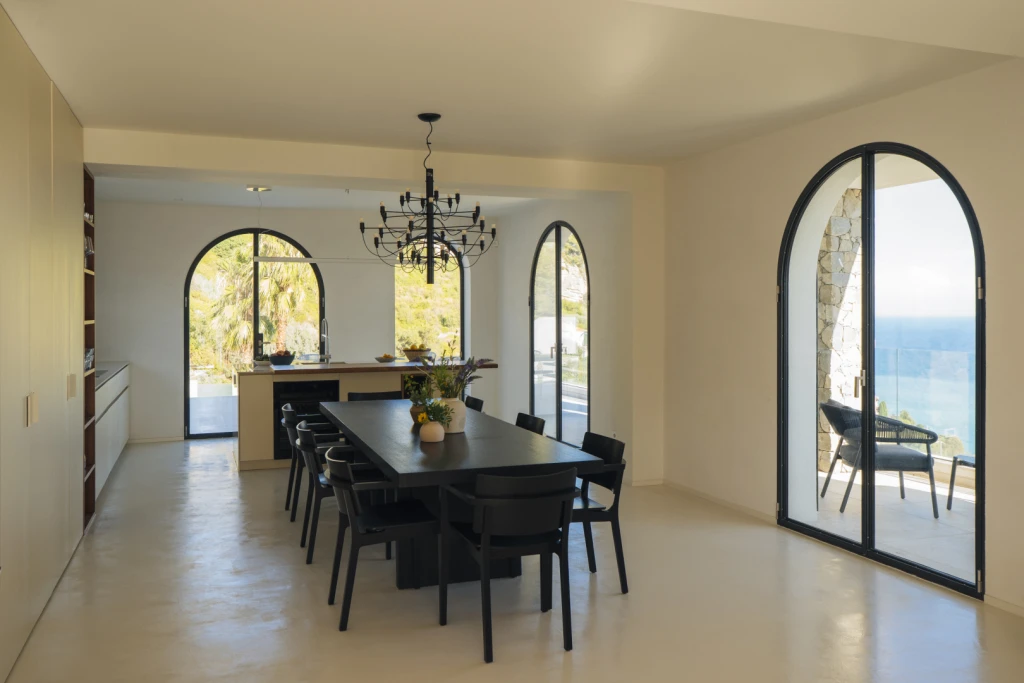 Designed to maximize its spectacular setting, the villa features a spacious open-plan living and dining area with large, arched windows that frame the stunning sea views. Glass doors lead directly onto the poolside terrace, where an infinity pool appears to merge seamlessly with the horizon. An alfresco dining area, an outdoor kitchen, and a jacuzzi with breathtaking views make this space perfect for entertaining or unwinding in style. The villa also boasts an outside private gym / a serene yoga area with a fantastic sea view for ultimate relaxation.